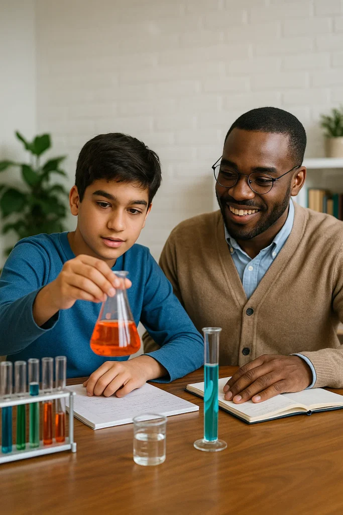 Visual Molecular Learning – Turn abstract chemical reactions into clear, visual steps your child actually understands. We use 3D molecular models, colorful reaction charts, and hands-on experiments to make bonding patterns and equilibrium equations come alive.